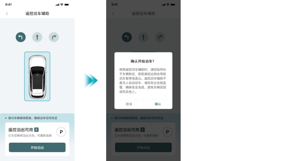 在手机界面点击“遥控泊车辅助”,待系统完成自检后,选择泊出方向,再点击“开始泊出”并确认,一键控制车辆泊出车位。