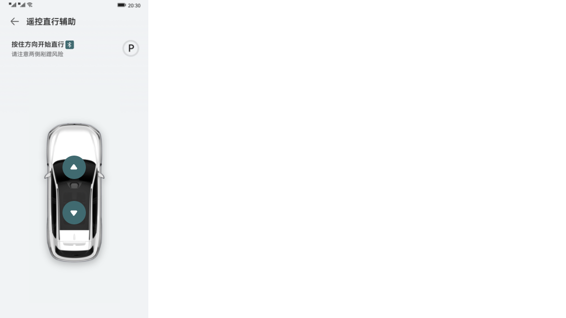 准备遥控直行时,无需上车启动车辆,驾驶员可以直接通过手机岚图汽车 APP的遥控直行辅助功能遥控车辆直线前进或后退,解决窄车位等场景的泊车问题。