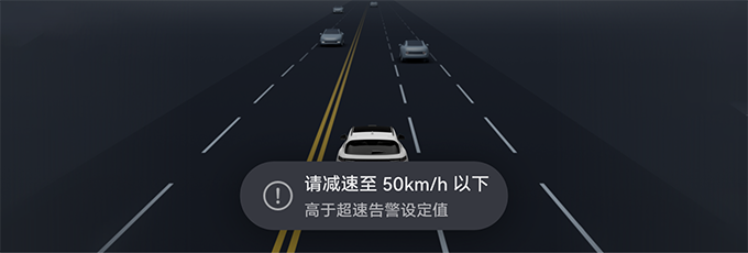 假设绝对告警阈值设置为 50 km/h,则当车速超过该值时,组合仪表上显示“请减速至 50 km/h以下”的弹窗提示,可选伴有提示音(若设置)。