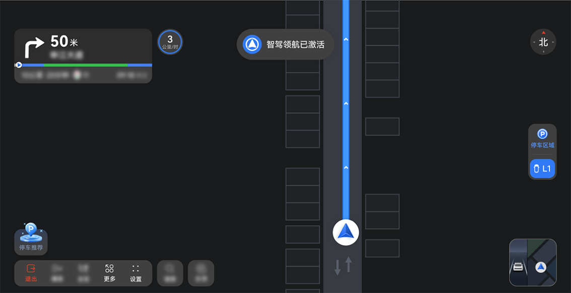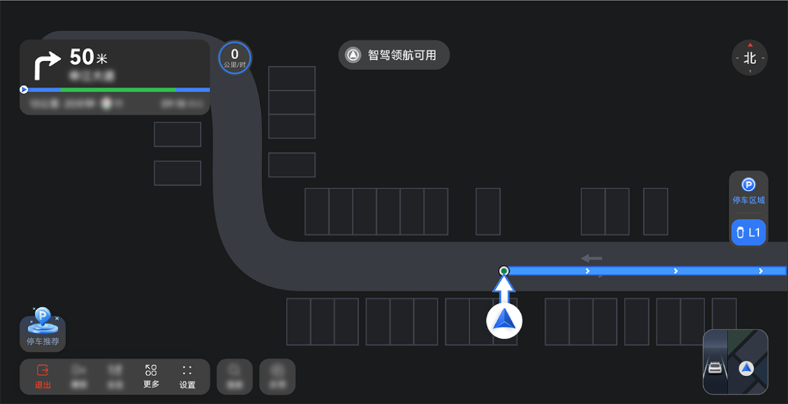 本节以起点位于支持车位到车位的停车场内为例,说明如何激活车位到车位。(当起点位于公开道路上时,驾驶员可先在起点激活 NCA,再在即将抵达目的地时通过中控屏是否弹出“停车推荐”卡片,判断该次行程是否为车位到车位行程。)